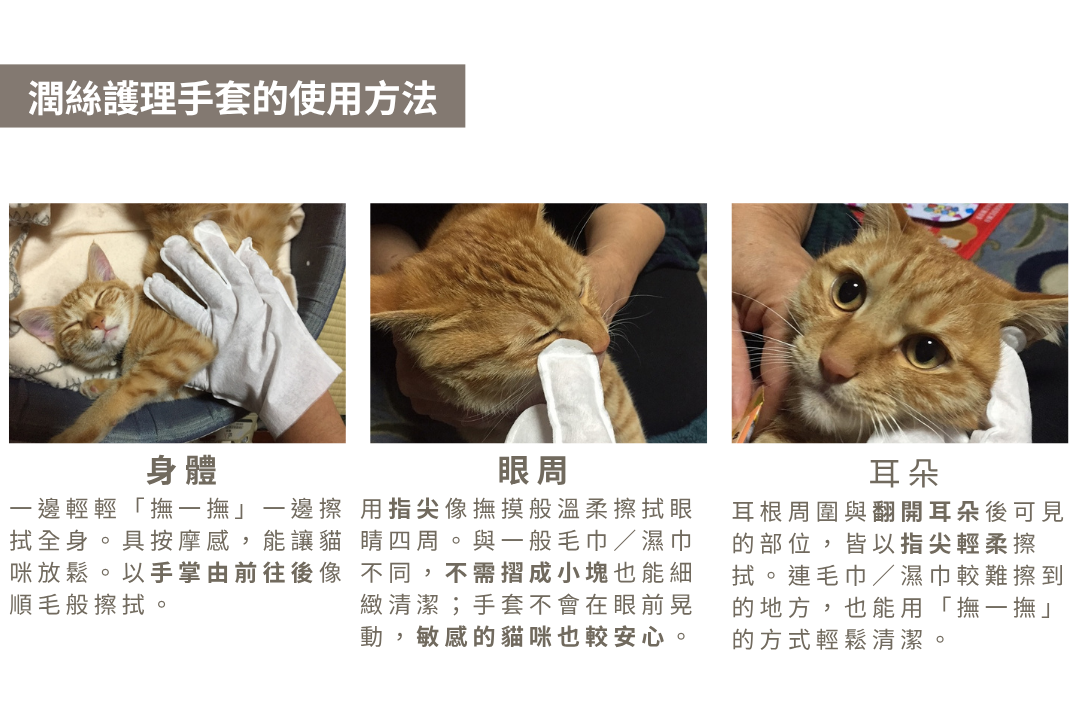 A:手套型能貼合身形、好施力,連眼周、耳緣、肉球縫等細部也能確實帶過;再加上植物由來除臭、不含酒精與Paraben,清潔更溫和安心,且左右對稱雙面可用更耐用。