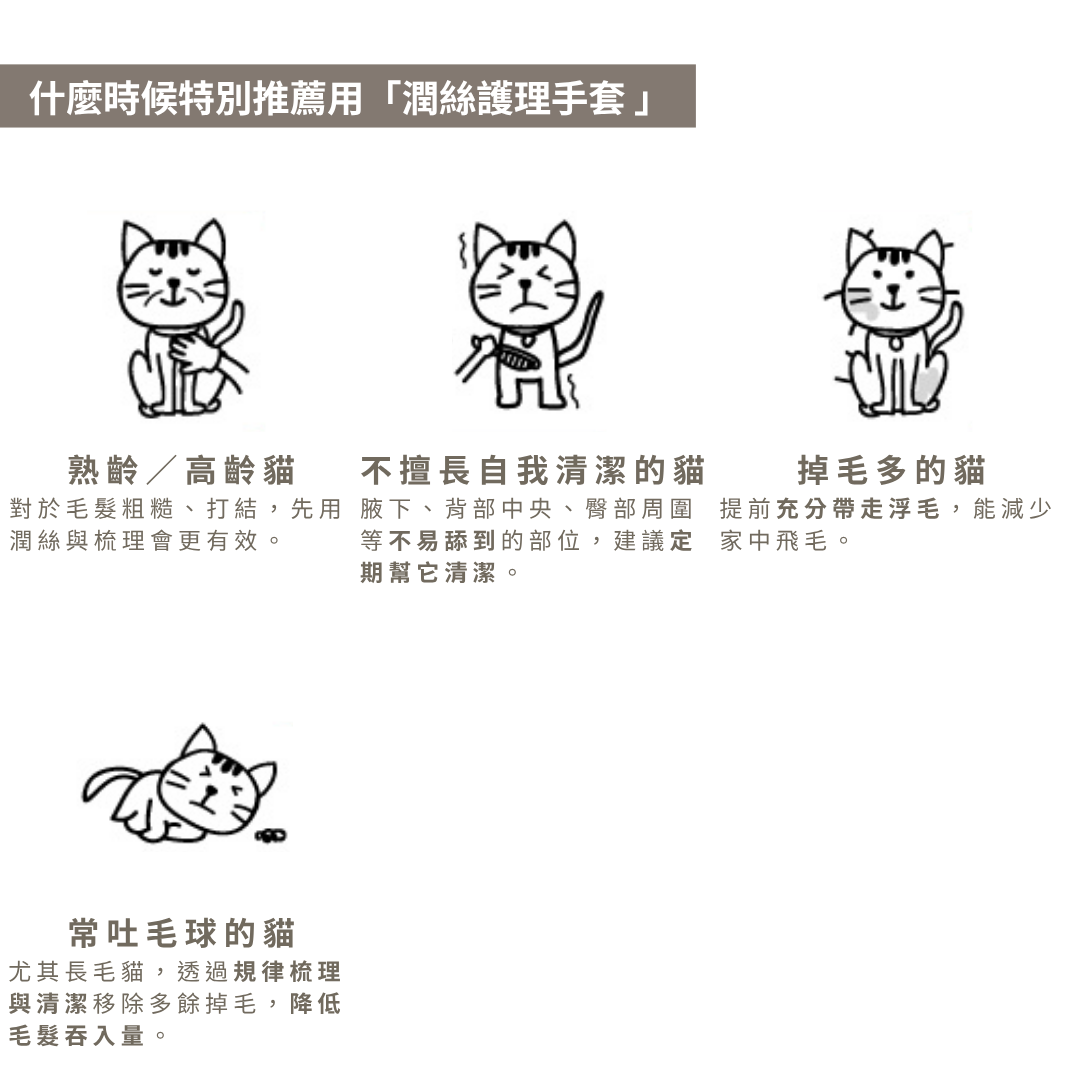 A:怕水、術後或氣溫低時特別實用;手套式的「按摩感」能降低警戒、提升接受度,幫助將污垢與異味分子帶走,恢復毛髮清爽。